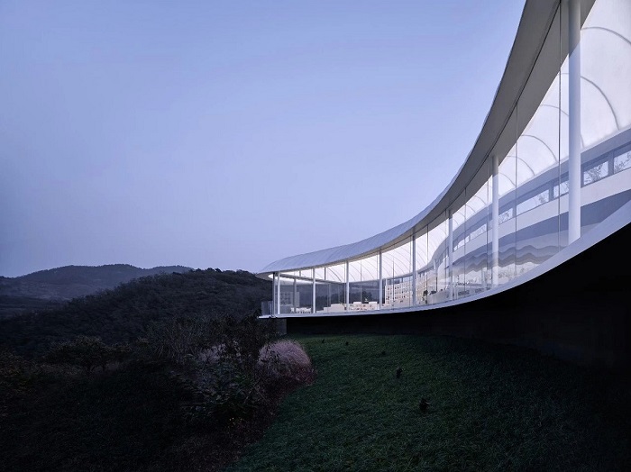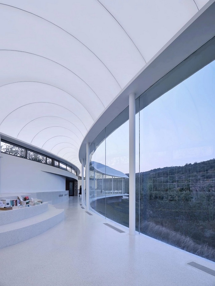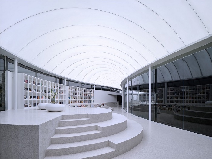 工程概況:泰安書吧膜結(jié)構(gòu)工程是一個(gè)集觀景、閱讀、休閑娛樂于一體的綜合項(xiàng)目,既有膜結(jié)構(gòu)建筑本身的現(xiàn)代化氣息,又有設(shè)計(jì)者及建造者高超技藝賦予的精致典雅,給人一種時(shí)尚別致卻又內(nèi)斂質(zhì)樸的觀感。本工程建筑屋面為流線形,建筑面積約600平米。外膜采用德國(guó)進(jìn)口白色環(huán)保膜材,內(nèi)膜采用PTFE內(nèi)膜,中間加保溫隔熱層,內(nèi)膜需要安裝燈光。屋面以下為全封閉空間,墻體采用落地玻璃形式,從各個(gè)角度都能獲得極佳的視野效果。