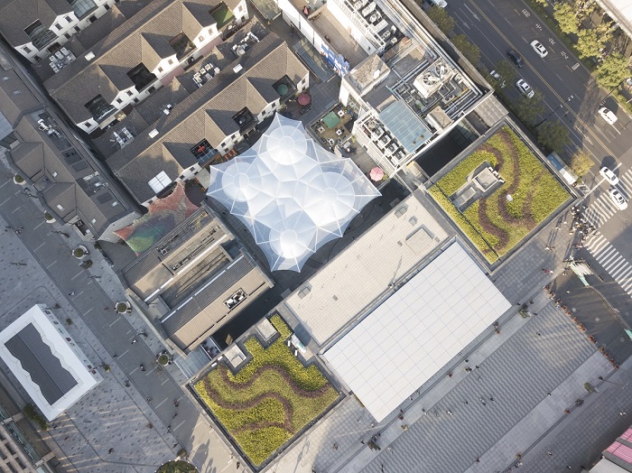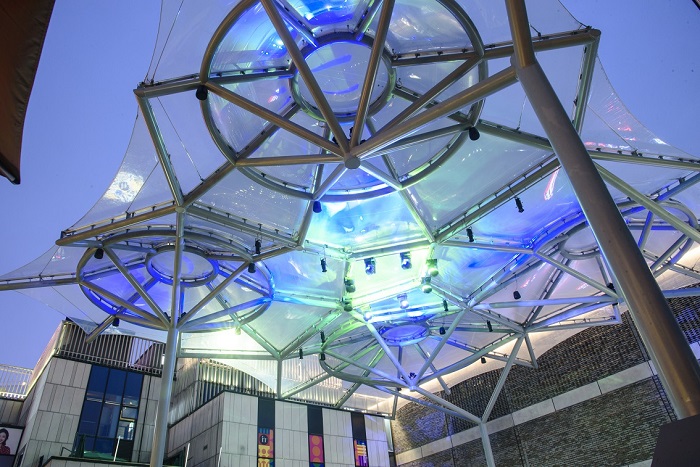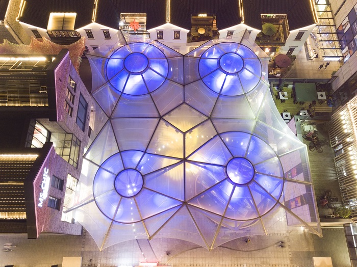 工程特點:該項目是國內首個單層ETFE加雙層氣枕膜完美嵌合的景觀雨棚建筑,利用ETFE膜材的高透光高自潔性以及雙層氣枕的隔熱能力,雨棚在具有遮陽擋雨功能的同時還可以實現(xiàn)自然采光,行人沒有傳統(tǒng)密封建筑的束縛感;另一方面,ETFE膜結構建筑是當代最新的建筑應用形式之一,工程高度定制,顏值高,具有唯一性,天生自帶聚集人氣光環(huán)。