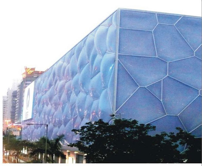 ETFE薄膜表面非常光滑,具有極佳的自潔性,灰塵、污漬隨雨水沖刷而去。對于外表的人工清潔,一般4年進行一次即可。