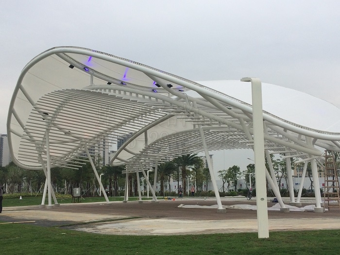 從建筑分類來說,膜結構是所有膜結構建筑的統(tǒng)稱,比如膜結構車棚、膜結構雨棚、景觀張拉膜、充氣膜、膜結構體育場館、膜結構沖浪池、膜結構崗亭等等,凡是用膜材料結合其它材料建成的建筑,都可稱之為膜結構。需要注意的是,膜結構是永久性建筑,一般都是基礎固定的。