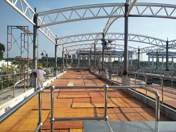 現(xiàn)場負(fù)責(zé)人告訴我,燁興龍華水廠膜結(jié)構(gòu)項目鋼構(gòu)加工目前已經(jīng)到達(dá)收尾階段,目前工人正在對鋼結(jié)構(gòu)進(jìn)行補(bǔ)漆工作。我們上到水池高臺后,也注意到在最靠里的邊角,一群工人正在抓緊施工。水池上全鋪了防污染蓋板,現(xiàn)場負(fù)責(zé)人指著正在施工的那片區(qū)域說,那是鋼結(jié)構(gòu)最后的施工地點,也將是第一片膜材安裝地點。小編內(nèi)心猜測,你說得這么確定,是因為那里鋪滿防污染蓋板,正好不拆留著今后方便使用吧。