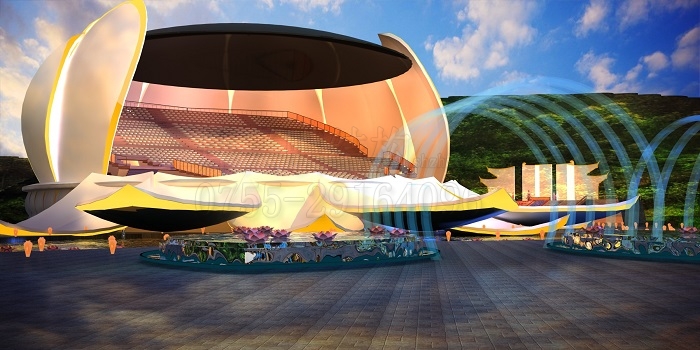 燁興云浮蓮花景觀型膜結(jié)構(gòu)舞臺是一個非常獨特巧妙的轉(zhuǎn)動式舞臺建筑,全部采用鋼模結(jié)構(gòu)制作。這個機械式舞臺造型取自在佛教寓意深遠(yuǎn)的蓮花,為了營造與眾不同的觀賞效果,這朵巨型蓮花舞臺表演過程中會緩慢轉(zhuǎn)動,蓮花的花瓣也會隨著場景需要進行開合操作??梢韵胂笠幌?,觀眾在一朵“活的”蓮花里欣賞節(jié)目表演,會得到怎樣的奇妙體驗。