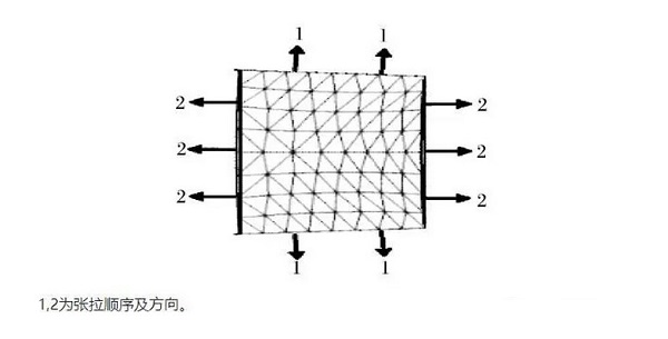 預(yù)應(yīng)力對(duì)于膜面施加次序:保證膜單元體在施加預(yù)應(yīng)力時(shí),先角部后中部;先短邊后長(zhǎng)邊依次進(jìn)行,并保持對(duì)稱性張拉。
