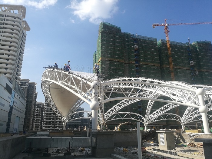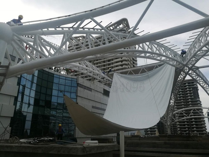 海南遠(yuǎn)大廣場3D天幕膜結(jié)構(gòu)項(xiàng)目是典型的商業(yè)廣場建筑,由我們燁興膜結(jié)構(gòu)設(shè)計(jì)建造,目前鋼結(jié)構(gòu)已經(jīng)安裝完成,正在進(jìn)行膜布安裝。此工程以純白色為主,粗大而精致的鋼結(jié)構(gòu)骨架撐起接近6000平方米的穹頂天幕,是由兩種高質(zhì)量的膜材按花瓣圖案依次拼接而成。厚重的鋼結(jié)構(gòu)設(shè)計(jì)及考慮了海濱城市的抗風(fēng)要素,異種膜材的拼接則讓巨大穹頂在白天時具有視覺上的層次感。