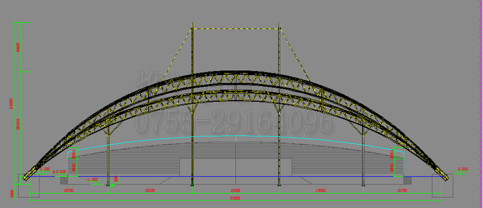 吉安體育場鋼膜結(jié)構(gòu)工程最大建筑高度為 31 m,長89米(示意圖如下所示),建筑層數(shù)為1層,結(jié)構(gòu)形式采用鋼膜結(jié)構(gòu),工程面積1858平方米,基礎(chǔ)形式為鋼筋混凝土基礎(chǔ),兩者采取同心異徑管連接方式,抗震設(shè)防烈度6 級。