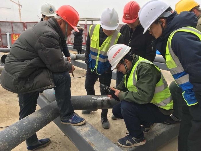 上圖為廣西建筑中心檢測員對表面打磨處理的焊口進(jìn)行探傷檢測