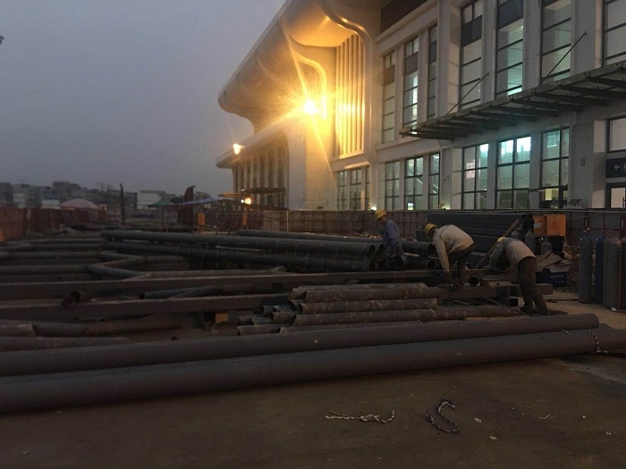 一周多的忙碌后,目前我們已經(jīng)將帶去的數(shù)控機(jī)器組裝完畢(雖然主要鋼構(gòu)部件在專業(yè)鋼構(gòu)加工廠進(jìn)行,但是現(xiàn)場一些材料還是要數(shù)控機(jī)器下料才能保證精度),目前正在進(jìn)行胎架的組裝拼接,已完成工程總量的20%。作為當(dāng)今最具技術(shù)含量和戰(zhàn)略意義的大型公共建筑工程之一,高鐵站集眾多先進(jìn)建筑科技于一體,對準(zhǔn)入的建筑形式和建筑服務(wù)商都有很高要求。我們施工過程中也感受到了這種高標(biāo)準(zhǔn)的嚴(yán)格氣氛,特別是結(jié)構(gòu)安全這塊,從材料的選擇到加工工藝,監(jiān)理方都全程進(jìn)行跟蹤監(jiān)控,如鋼構(gòu)部件的拼裝焊接后,會(huì)要求我們將焊口打磨光滑,然后逐個(gè)進(jìn)行探傷檢查,確保每一個(gè)都質(zhì)量合格。