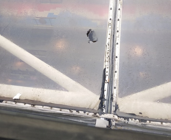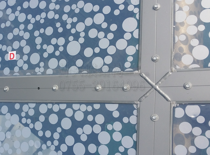 以上是某商業(yè)中心ETFE屋面的外觀圖。這是單層ETFE膜結(jié)構(gòu)屋面,做成這樣的效果,原因是承建單位沒有ETFE膜結(jié)構(gòu)的技術(shù)實力和施工經(jīng)驗,這是將安裝普通PVC膜材的壓膜方法生搬硬套導(dǎo)致的后果。外行人可能會覺得:看起來雖然不美觀,但從里面又看不到,不影響實際使用。而從專業(yè)角度來看,這樣的工程可以歸類為垃圾工程。上面的工程,有幾個明顯的缺點:1、使用不專業(yè)的壓膜方法,在膜面上開孔,降低了整個膜面的抗壓強度,雨水還可能通過螺栓處進(jìn)行內(nèi)滲,造成漏水和銹蝕破壞;2、使用普通膠水進(jìn)行防水密封,ETFE膜材是不粘材料,膠水老化一段時間后,密封防水效果就會消失,進(jìn)而出現(xiàn)內(nèi)漏。從圖中也可以看到,屋面的低點應(yīng)該已經(jīng)出現(xiàn)滲水現(xiàn)象,所以打了一層厚厚的防水膠,左側(cè)的壓膜板上的螺栓不規(guī)整且較密,那是因為滲水嚴(yán)重而臨時加固的。