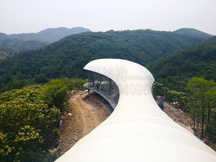 工程介紹:泰安書吧膜結(jié)構(gòu)工程是一個(gè)集觀景、閱讀、休閑娛樂于一體的綜合項(xiàng)目,既有膜結(jié)構(gòu)建筑本身的現(xiàn)代化氣息,又有設(shè)計(jì)者及建造者高超技藝賦予的精致典雅,給人一種時(shí)尚別致卻又內(nèi)斂質(zhì)樸的觀感。本工程建筑屋面為流線形,建筑面積約600平米。外膜采用德國(guó)進(jìn)口白色環(huán)保膜材,內(nèi)膜采用PTFE內(nèi)膜,中間加保溫隔熱層,內(nèi)膜需要安裝燈光。屋面以下為全封閉空間,墻體采用落地玻璃形式,從各個(gè)角度都能獲得極佳的視野效果