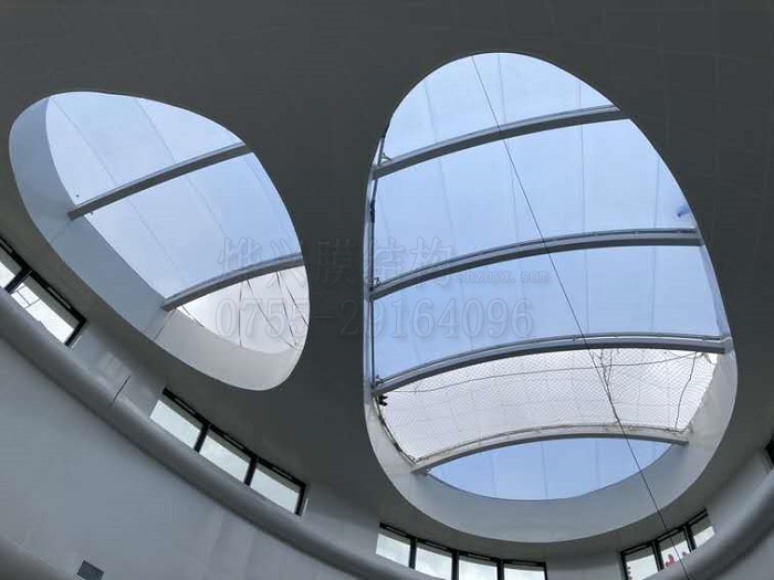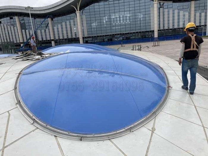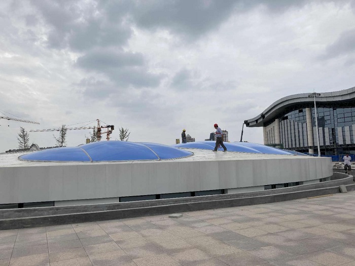 山東濰坊高鐵站ETFE膜結(jié)構(gòu)裝飾屋面是一個有故事的項目,屬于高鐵站前的地下廣場的采光頂屋面。作為一個人流量巨大的高鐵站配套項目,需要考慮安全、環(huán)保、節(jié)能等因素,于是ETFE膜結(jié)構(gòu)的制作方案很快就被各方認(rèn)可。當(dāng)初有人建議說要使用玻璃方案,但最終被否決了,原因是作為地下廣場的采光屋面,與外部地面基本平齊,用玻璃的話需要用較厚重的鋼化玻璃,需要投入更多的結(jié)構(gòu)承重預(yù)算;玻璃只能做成平面的普通天窗,不能做出ETFE那種美麗的高弧度氣泡效果,高鐵站屬于地標(biāo)建筑,需要美麗可靠的特殊建筑進行點綴。