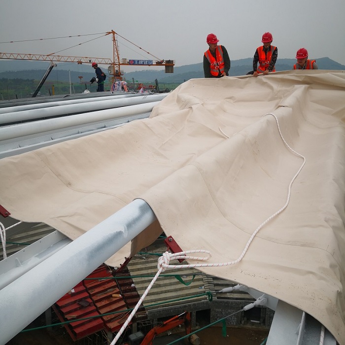 京山國際網(wǎng)球賽事中心的屋面材料選用的是進(jìn)口白色PTFE膜材,在燁興自有加工廠裁剪加工。這里需要科普一下,正宗的PTFE膜材從出廠到裁剪加工,一開始是呈棕色或者棕褐色的(單位克重越大,顏色越深),如現(xiàn)場(chǎng)圖片所視,在經(jīng)過陽光直射約3到5個(gè)月后,膜材將轉(zhuǎn)變?yōu)楦蓛敉ㄍ傅陌咨?,直至達(dá)到膜材使用壽命。