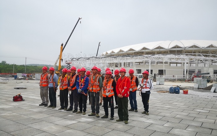 隨著夏季酷暑天氣的到來,高空露天作業(yè)將越來越困難,施工環(huán)境、包括工具都是滾燙的,人也要忍受烈日的炙烤。好消息是,科學(xué)合理的工作布置加上高效的施工執(zhí)行能力,燁興-京山國際網(wǎng)球賽事中心主場館的第一階段中心環(huán)部位的膜材吊裝已經(jīng)完成,后續(xù)二次張拉調(diào)整、安裝并熱合擋水批簾工作等可以放在涼爽的夜晚進行。