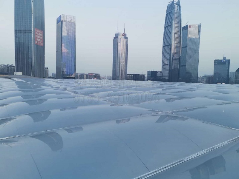 其次從結(jié)構(gòu)形式上分,可將ETFE膜結(jié)構(gòu)歸為兩大類:單層ETFE膜,雙(多)層氣枕膜。它們都需要采用專門的鋁合金支架進(jìn)行支撐固定,并且根據(jù)一定規(guī)律分割成膜單元。單層ETFE膜外觀造型比較簡單,看起來和玻璃相近;雙(多)層氣枕膜需要使用專業(yè)的充氣系統(tǒng)進(jìn)行智能充氣,保持膜氣枕鼓起,從而獲得立體的氣泡美感和良好的保溫隔熱性能。ETFE氣枕膜是目前最新奇炫麗的屋面形式之一,每個作品都成了吸引客流的城市地標(biāo)。需要注意的是,ETFE氣枕膜屋面,一旦投入使用后,就必須保持充氣設(shè)備運行穩(wěn)定,保證氣枕內(nèi)的氣壓在設(shè)計要求值內(nèi)。