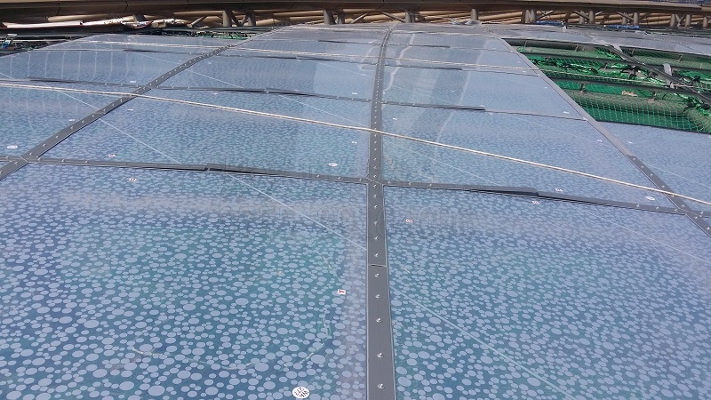 最后是ETFE膜材顏色,常規(guī)的有無色透明、淡藍(lán)、乳白色、透明加花紋鍍點等。膜材顏色方面,一般是根據(jù)項目追求的效果去選用。無色透明、淡藍(lán)、乳白色等,都是純色的,其透光度等性能都比較固定。這里主要說一下使用最廣泛的透明加花紋鍍點膜。在透明膜上增加花紋鍍點,目的是調(diào)節(jié)陽光的通過率,使屋面下的光照環(huán)境更舒適宜人。鍍點花紋的形狀、大小、排布間隔等,都是可以定制的,廠家現(xiàn)貨也提供多種常規(guī)選擇。雖然膜材上加了鍍點,但是當(dāng)屋面離地面10米以上時,視覺中,鍍點屋面看起來幾乎是透明的。