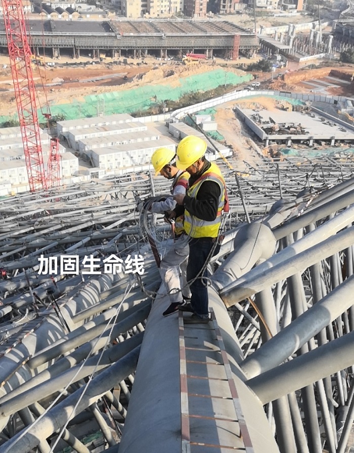 這是燁興公司參建的2023十座亞洲杯足球館中的第三座。白鷺體育場建筑形體取閩南古厝之曲線神韻、再現(xiàn)瓦屋頂之斑駁肌理,寓古于新、大氣磅礴。我們的工作,是運用十八年來一直專注膜結構工程所積累的經(jīng)驗能力,用PTFE膜為體育場覆上曲線優(yōu)美且造型獨特的外觀屋蓋。如今燁興團隊正在進行二次鋼構件的施工安裝,現(xiàn)場正有條不紊等進行膜結構安裝先期準備工作。
