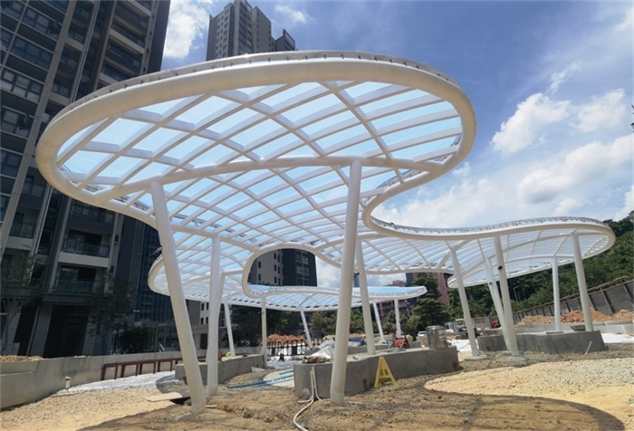 “雙魚亭”位于深圳鹽田太平洋工業(yè)區(qū)公園綠地一角,實(shí)地查看可知,現(xiàn)場(chǎng)有工人正在進(jìn)行地面的裝飾和綠化配套,我們鋼膜結(jié)構(gòu)部分的工作已經(jīng)完工撤場(chǎng)。